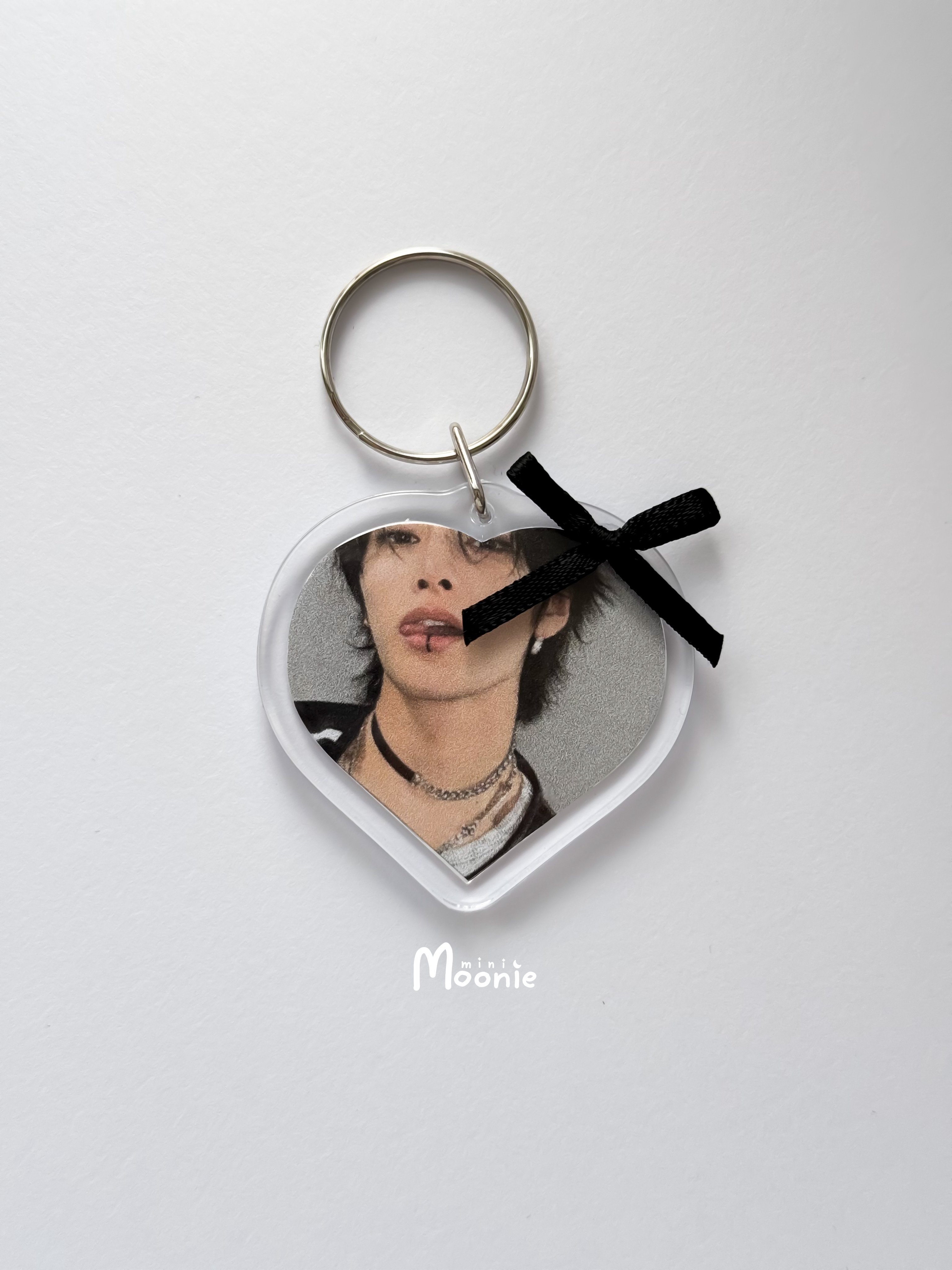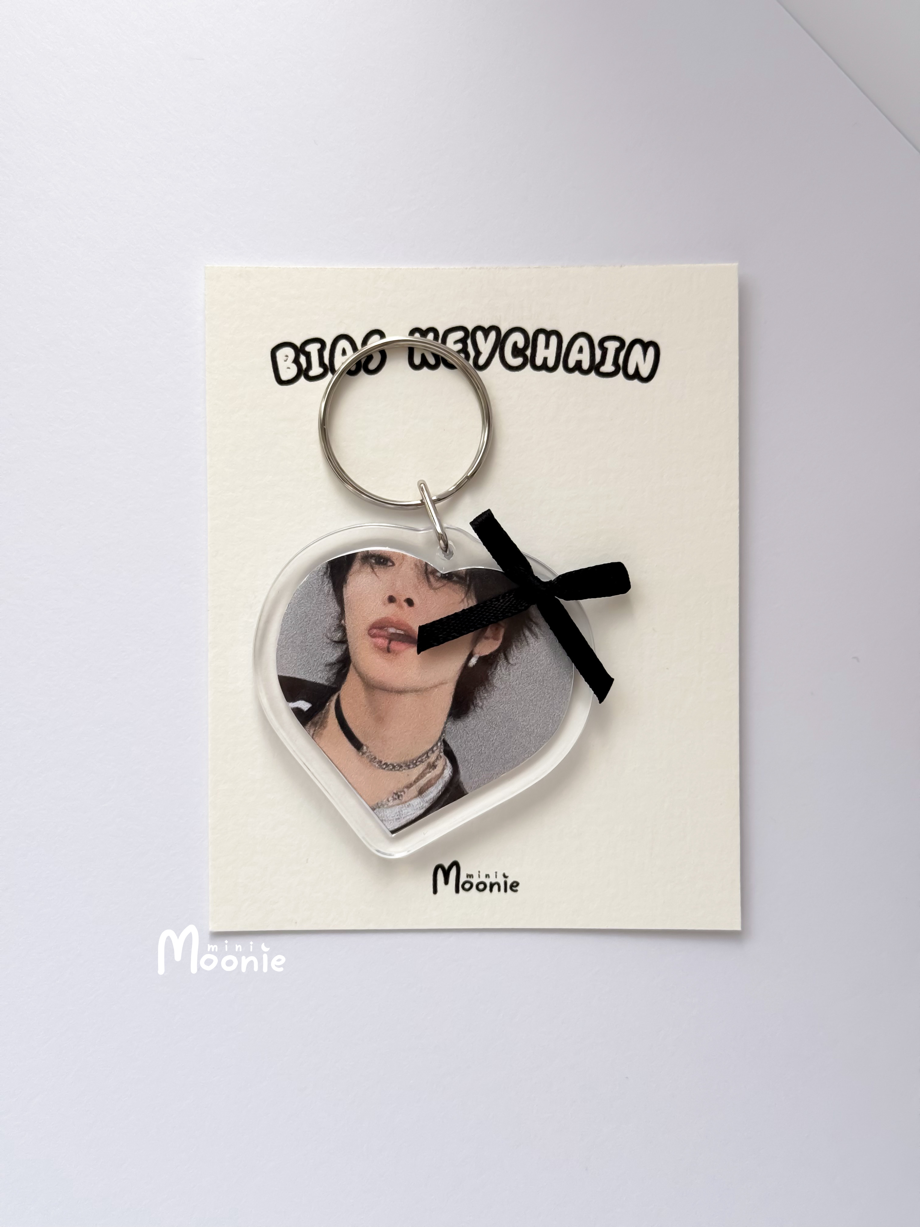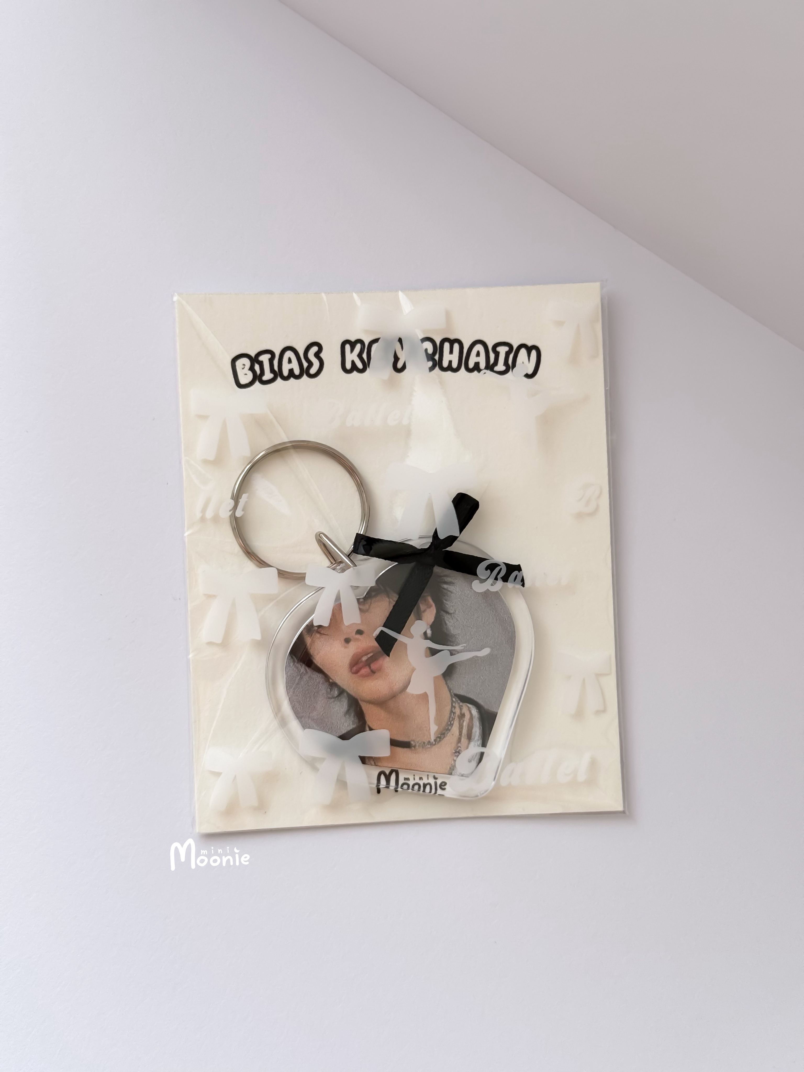 - heart keychain with a small bow attached to it (the photo of your bias inside the keychain)